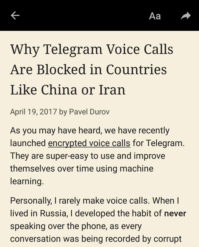 With Instant View, Telegram users can enjoy articles from any mass media or blogs in a uniform and easily readable way. Instant View pages support text and media of any type and work great even if the original website was not optimized for mobile devices.