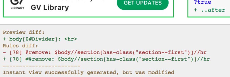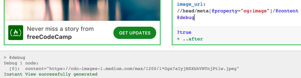 The middle section of the page is where you create your template for the chosen domain name or URL. Templates consist of simple instructions to our IV bot we call rules. You can later study the syntax in detail here. Once you've saved your rules for the page (cmd + S or ctrl + S in the Rules window), the window on the right will display the Instant View page that the IV bot would create based on the current instructions.