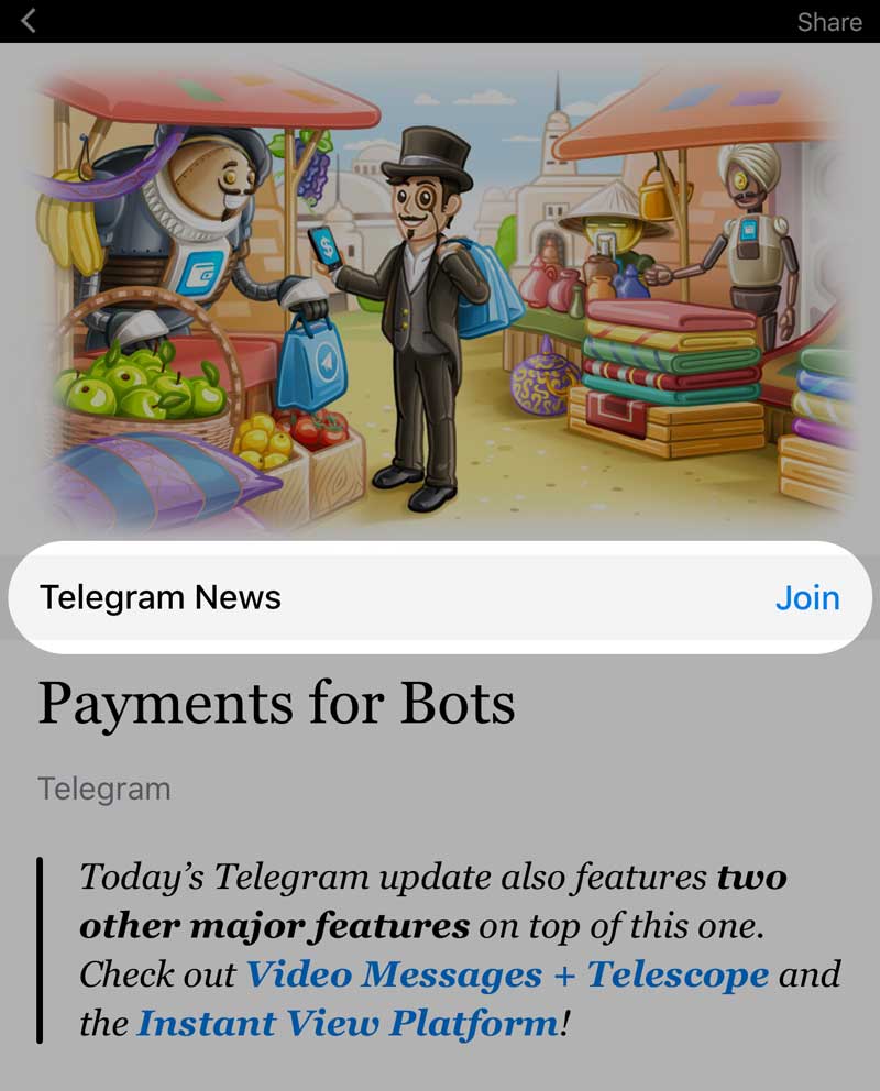 Instant View allows Telegram users to view articles from around the Web in a consistent way, with zero loading time. When you get a link to an article via Telegram, simply tap the Instant View button, and the page will open instantly.